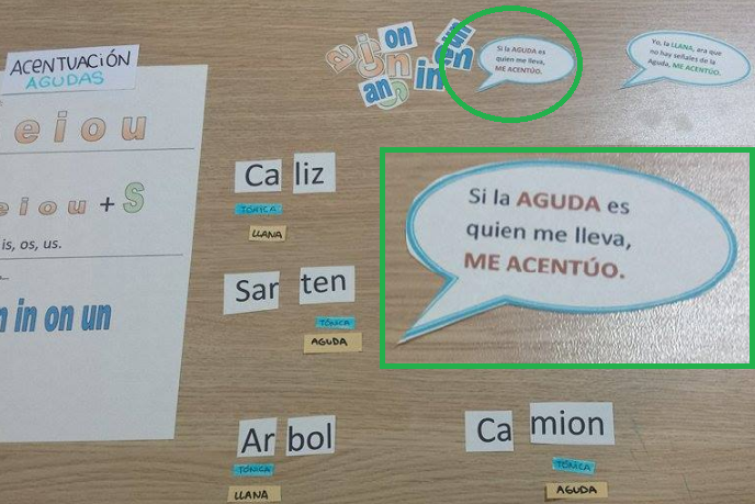 Ahora, hará falta tener las mismas letras impresas, para que así los niños puedan cogerlas y trabajar con ellas. Previamente las palabras han sido separadas por sílabas, señalada la sílaba tónica y especificado si son Agudas o Llanas.